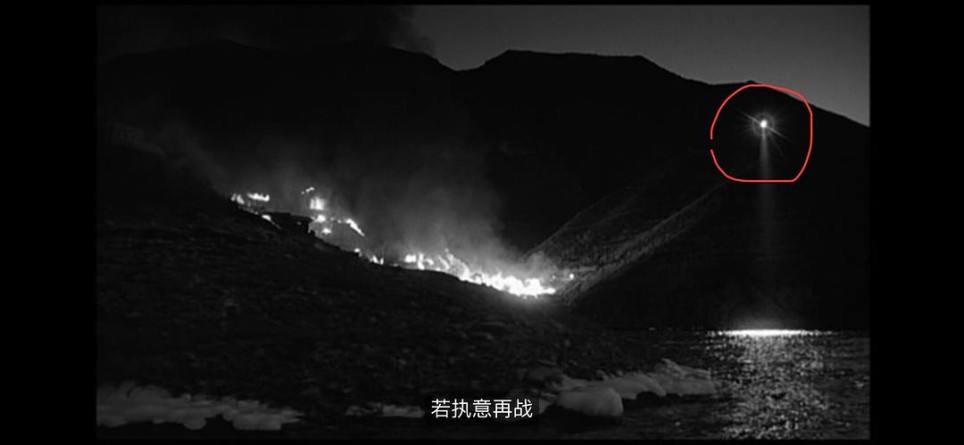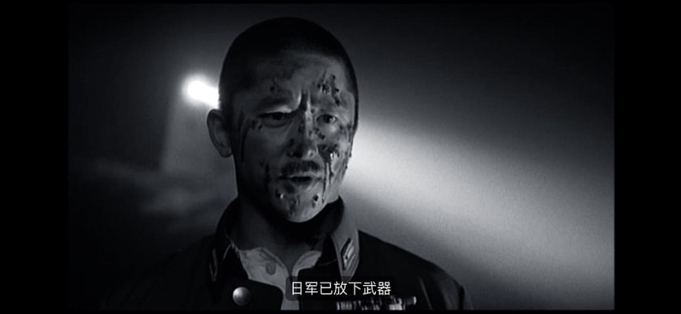 紧接着下面这个镜头就更直接了,酒冢猪吉一边说着投降,身后的炮楼却仍在射出刺眼光芒。在一部这样的片子里,这些对炮楼的镜头绝对不是随便安排的,我相信导演是有意让人物与身后的炮楼同框,为的就是引起观众的思考。 炮楼隐喻的是人“背后”的精神。搭配上台词一起看,内涵是什么就不言而喻了:日军表面上说“已放下武器”,背后是怎样我们却要打个问号。