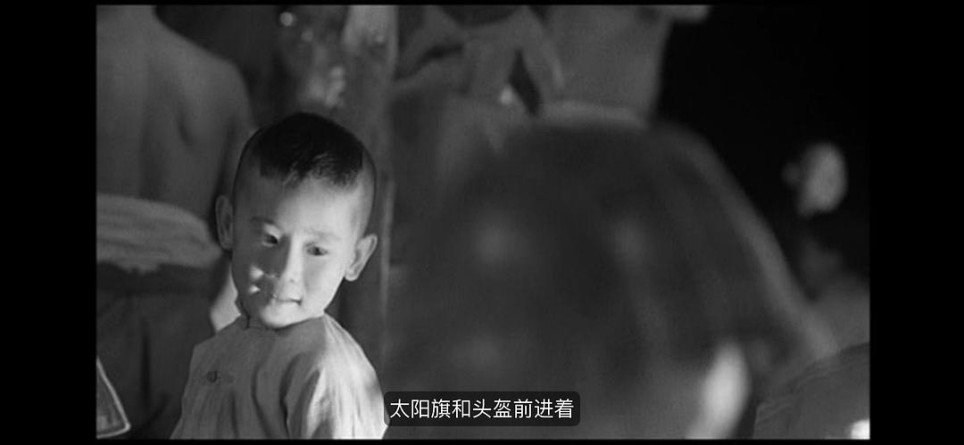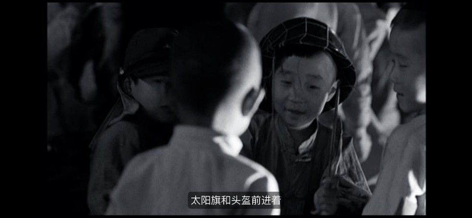 2.片中01:45:25 处村中举办联欢晚会时,还有一个只持续3秒一闪而过的镜头很重要,是两个戴着日本军帽和军盔的小孩穿过了另外两个中国穿着的小孩,配合背景中日本士兵唱的歌词“前进着”,我想这个镜头要表达的意思也是不用说就很明确了,就是涉及如何教育后代看待这段历史的问题,还有暗示军国主义在年轻人中可能的复苏倾向。 (要素察觉:电影的1小时45分和1945年,当然也可能是我想多了)