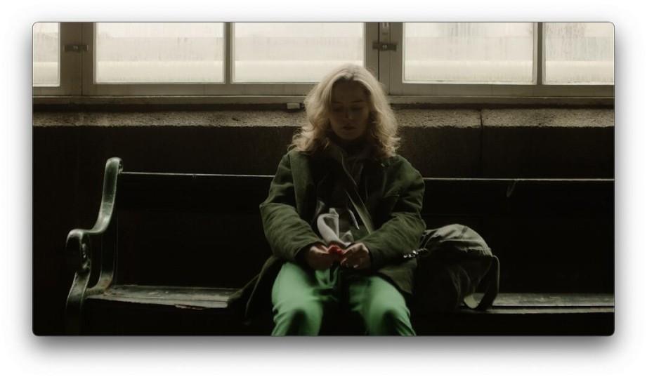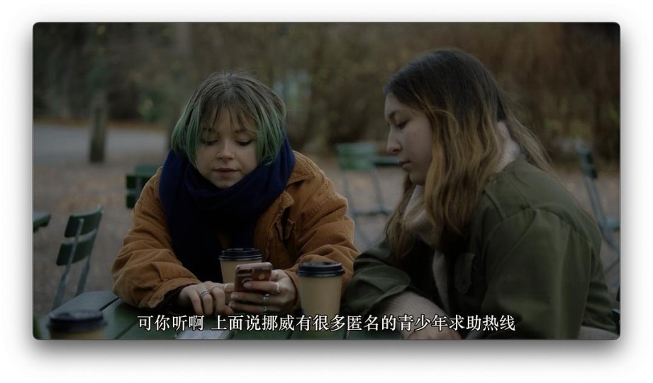 约翰妮在长椅上拿起U盘思考与老师的过往,灰色帽衫外是绿色的外套