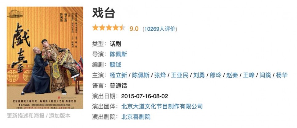 《戏台》的编剧是毓钺先生。话剧在豆瓣评分9.0。