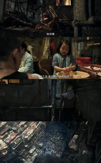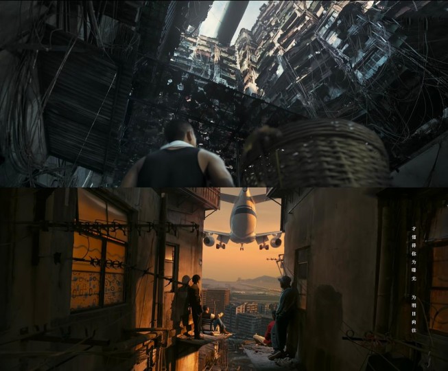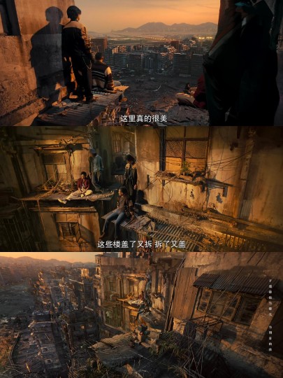 2️⃣飞机✈️ 飞机是先进、发展。开篇和结尾都有飞机从城寨顶空飞过的画面,第一次,陈洛军作为底层,只能仰望另一个世界,结尾时,飞机又一次从城寨顶空飞过,四子坐在城寨高空感叹,也是说明时代巨变即将来临,城寨作为短暂的历史和记忆,将被拉入时代发展,消失。结尾是四子和城寨告别,也是电影故事和观众告别,告诉屏幕前的你我:好啦,我们的故事讲完啦,再见!四子舍不得城寨,我舍不得结束这个故事。