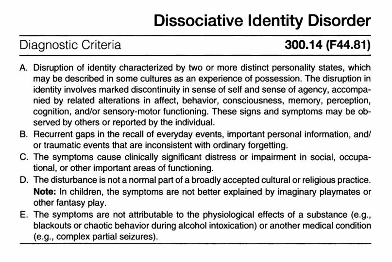 首先,咱们口语中所谓的多重人格在DSM-5诊断手册里的正式名称叫做Dissociative Identity Disorder (DID),分离性身份识别障碍。DID的核心在于,一个人在长期的极度创伤下,发展出两个或以上相对独立的人格状态。其中主人格通常叫做the self或host,副人格叫做alters。主副人格各自拥有稳定的感知、思维和行为模式。一些的临床表现包括:记忆和时间的缺失,失去自我掌控感,现实检验功能受损等等等等。这些在后面都会提到。