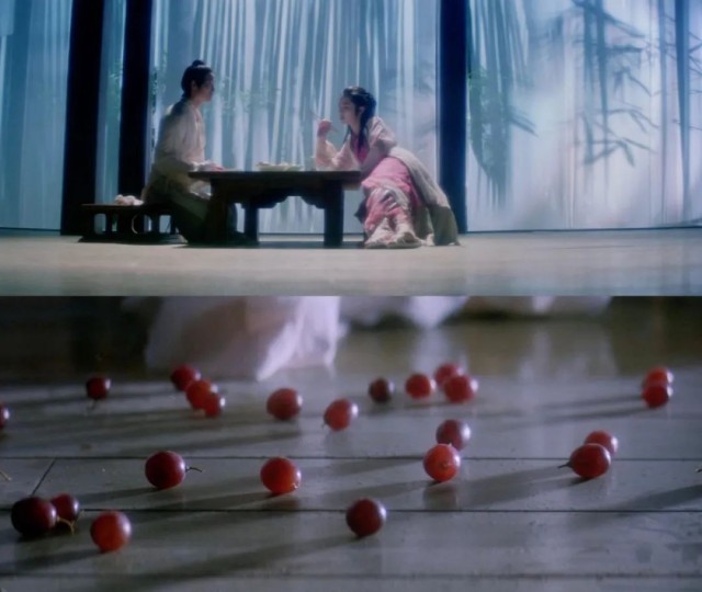 还有一场与其类似的戏,小青故意挑逗许仙,喂给他吃了颗葡萄,许仙僵坐在那里,迟迟不吐出葡萄核,后来还趁姐妹俩不注意偷偷捡起地上的葡萄吃。这其实是在说,许仙把持不住小青的挑逗,已经对她动了心,精神出轨了却还假装没事。