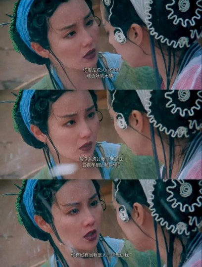 女性主体意识还表现在,电影从头至尾都把姐妹情立于男女爱情之上,姐妹俩有很多深刻的感情交流,也有亲密的身体语言,你会感觉她们俩的关系才是坚固的,动人的,至于男女情爱,只不过是她们共同面对的一项课题,一个游戏。小青诱惑许仙让其动心后,白素贞一度与小青剑拔弩张,眼看就要落入姐妹俩抢男人的窠臼。但很快她们就和好了,小青承认自己挑逗许仙只是为了试探姐姐的反应,她根本就不在乎许仙,她只在乎姐姐。