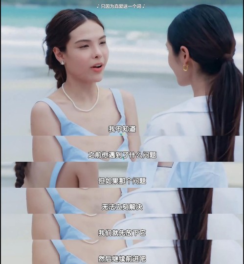 仿佛孤注一掷地直接挑明自己的身份并试探对方身份,Lookmhee语速迟缓,将Ai阔别母亲二十年的委屈不甘、诚挚渴望连同害怕期待落空的忐忑不安化为一个颤动的尾音。直至对方狠心否认自己有孩子,悲伤的情绪再也无法抑制,她发出两次气声,紧闭双眼听着手机忙音响彻耳畔,最后合上手机让泪水盈眶。Lookmhee对于气声的运用可以说是游刃有余,在沙滩被Mae所感动说了一句“谢谢”也是用的气声,这无疑很贴合Ai这个角色“脆弱但硬撑”的性格。 本剧截至目前仍维持着高质量,与精心雕琢的改编剧本、主创对场景花心思的编排、LMSY两位不可多得的好演员都是息息相关的。EP7注定是矛盾冲突到达最顶点的一集,希望剧本逻辑依旧清晰合理,运镜剪辑、妆造和BGM再接再厉。对于莓药没有更多的要求,因为她们在笔者心目中已经尽善尽美,唯有一个悬念:她们还有多少惊喜是朕不知道的吗?