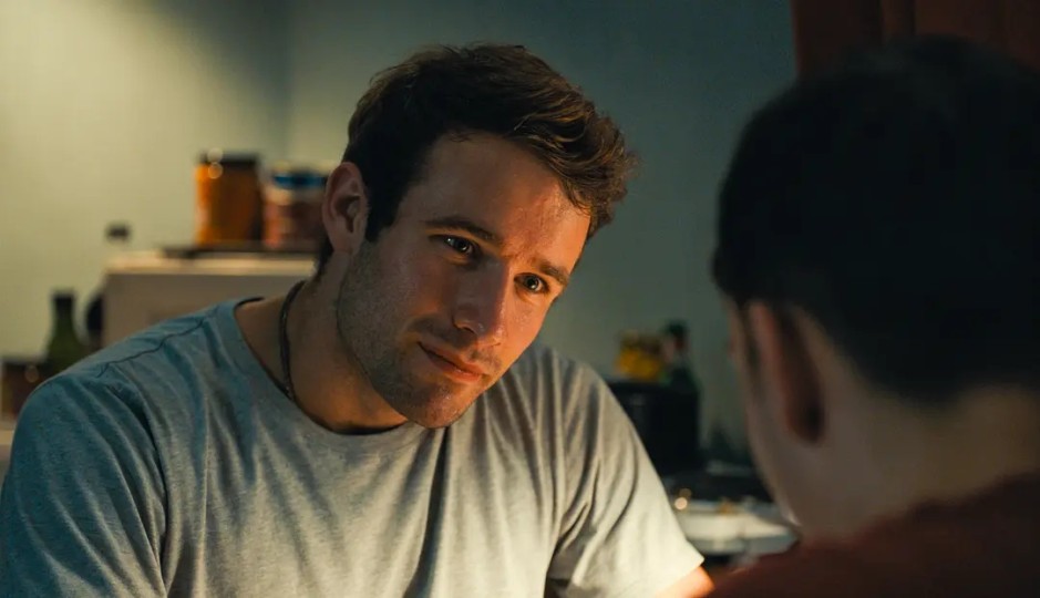 而提到和【call me by your name】的相似性,前者从未呈现某些全新的,酷儿电影之前不曾表达过的东西,但的确聪明得把握住几个关键的剧本要素:呈现充满差异感的两方角色,而在呈现双人关系时聚焦着其中一方的情感表达,以及苦乐参半的终将失去与被定格的暧昧时光,这样的设定如同直接构建了以Elio为中心的,足以凌驾在现实至上的青春幻梦土壤,为观众对于这种美丽幻想产生强烈代入提供可能。【Enzo】很直接的模仿了这些要素,但也在此基础上进行了独特的变体。不同于Elio隔靴搔痒的桃子探索,或是没来由的呕吐,在这部电影里我们看到的时Enzo对Vlad产生迷恋的情愫后更激烈、疯狂、乃至暴力的身体表达:直白的示爱、直接的触探、情急的拥抱与搏斗、失控地在家庭派对掏出假枪,和盘托出的出柜,以及最突如其来,在得知Vlad要回到乌克兰后的自我坠楼。这些都足以引起观众的更强烈的情感翻涌。但更与前者相反的时,这样短暂的相处关系,甚至无法被称之为一段“幻梦般的爱情时光”,性向的隔阂没有被丝毫撬动的痕迹,就像那个被Vlad带去蹦迪的夜晚,在门口就被门卫直接的因为年龄问题拦了下来,孤独的走入悬崖和星空。这样冲动与决绝的行为所对应的,好像是完全单方面的不存在任何实质价值的东西,没有“永恒夏日”的记忆,只有刺痛。